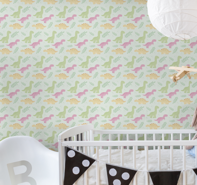 Il design di questa carta da parati è una festa per gli occhi! Con dinosauri dal look pastello e dallo stile cartone animato, questo modello è perfetto per bambini che adorano un'atmosfera giocosa e carina.