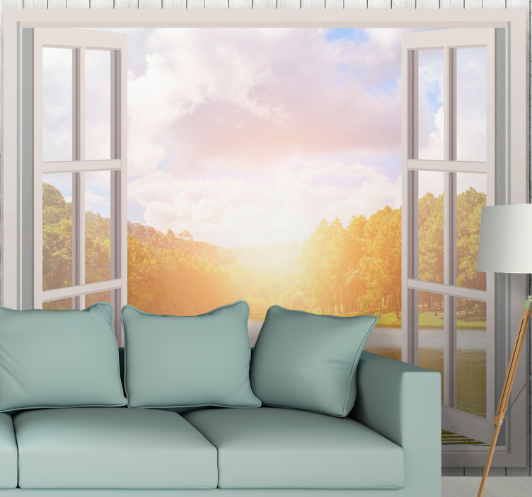 Scopri la meraviglia della carta da parati natura alba sul lago, un design che trasforma ogni ambiente in un'opera d'arte. Con una finestra che si affaccia su un incantevole paesaggio di alberi e foreste, il tramonto sul lago crea un'atmosfera magica e avvolgente. Questo trompe l'oeil è perfetto per chi ama immergersi nella bellezza della natura, portando la sensazione di un'alba serena direttamente nella tua casa!