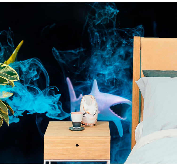 Scopri il nostro Fotomurale animali illustrazione di squalo colorato, un'opera d'arte che cattura l'essenza dell'oceano! Questo design vibrante presenta uno squalo immerso in un ambiente marino ricco di acqua, fumo e vita marina, creando un fotomontaggio sott'acqua che trasmette un senso di avventura e meraviglia.