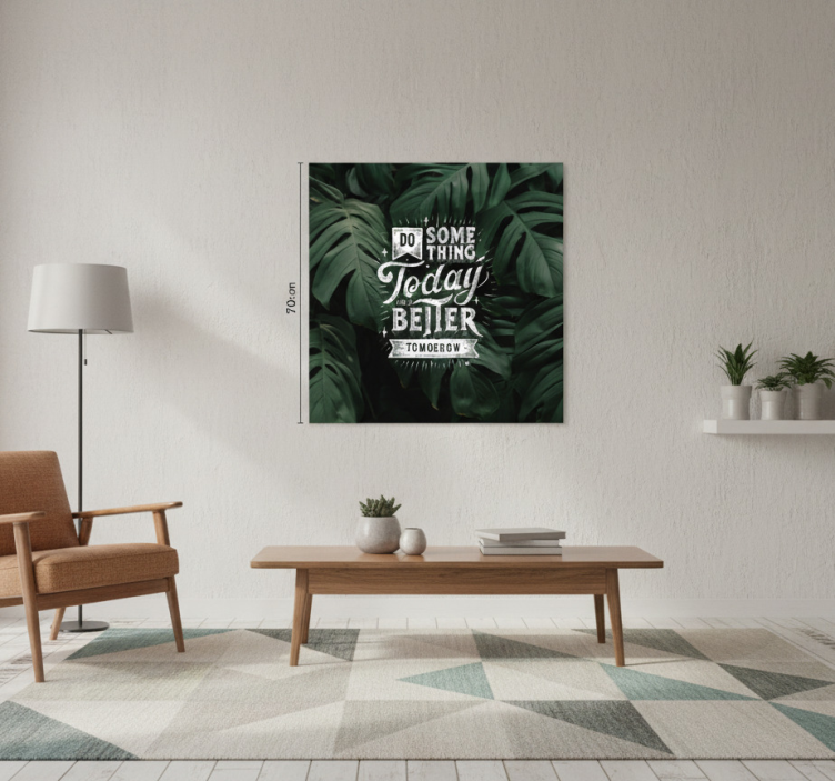 Riferimento: G814Un interno moderno mette in mostra un'opera d'arte vivace, con un testo motivazionale tra lussureggianti foglie verdi. La frase incoraggia ad agire positivamente oggi per un domani migliore. Una poltrona accogliente e un arredamento minimalista completano l'estetica elegante, creando un'atmosfera invitante che promuove ispirazione e tranquillità.
