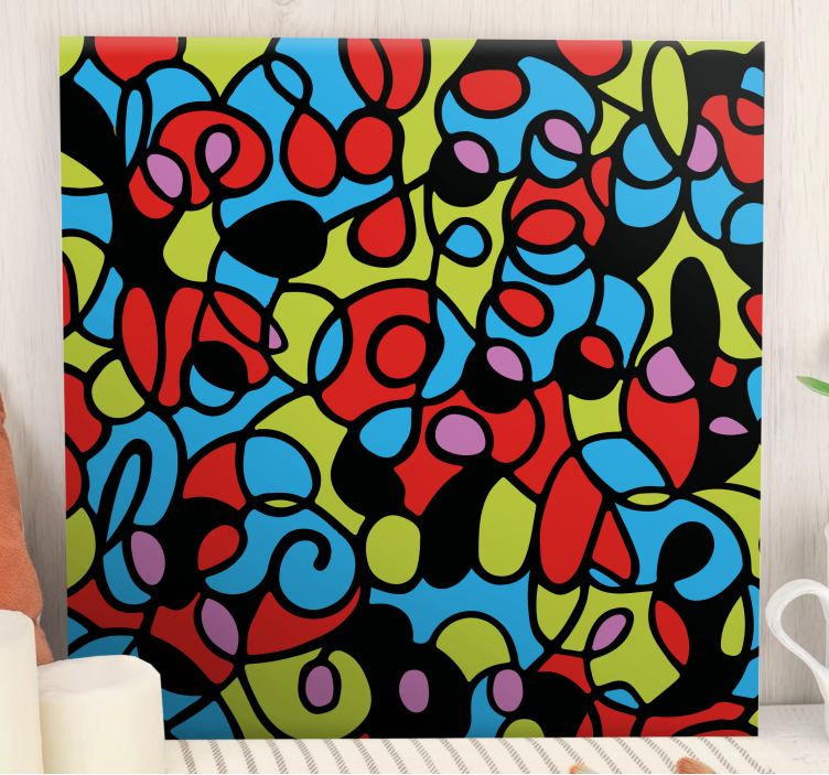 Riferimento: Q8726Una composizione vibrante che presenta una dinamica varietà di forme vorticosi. Il design è caratterizzato da un mix giocoso di colori, tra cui rossi, blu e verdi audaci, intrecciati in un motivo astratto. Questo pezzo affascinante energizza qualsiasi spazio con il suo design vivace.