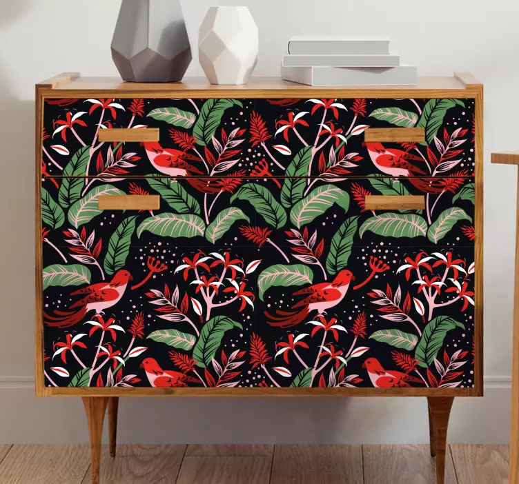 Il nostro adesivo concetto floreale tropicale è un'esplosione di colori vivaci, con foglie e uccelli che si intrecciano in un design floreale tropicale. Le tonalità di rosso e verde si uniscono per creare un modello che porta la natura direttamente nel tuo spazio, rendendolo perfetto per chi ama l'arredamento originale e ricco di personalità!