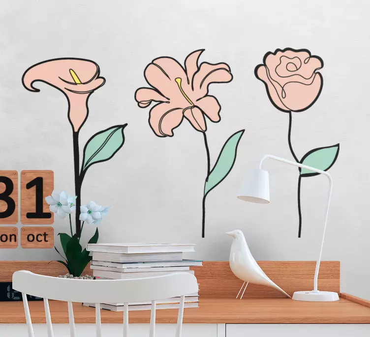 Scopri il nostro adesivo fiore composizione di fiori eleganti, un'opera d'arte botanica che trasforma qualsiasi ambiente in un angolo di natura. Il design è caratterizzato da un elegante disegno di fiori dai colori pastello, perfetto per chi desidera aggiungere un tocco decorativo e raffinato alla propria casa o ufficio.