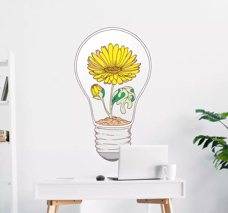 Scopri il nostro adesivo lampadina fiorita, un design che unisce la bellezza della lampadina e l'energia di un girasole circondato da foglie verdi. Questo fiore rappresenta la natura e la crescita in modo concettuale, con toni di giallo che portano luce e vitalità in ogni ambiente. Un’illustrazione che trasmette gioia e freschezza!