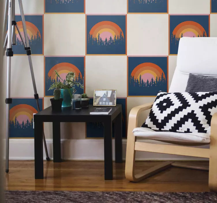 Scopri il nostro Adesivo località scena forestale al tramonto, un prodotto che cattura la bellezza della natura con un design incantevole. Con un sole splendente che si riflette tra gli alberi della foresta, questo adesivo presenta piastrelle colorate che evocano il calore e la serenità del tramonto, creando un paesaggio suggestivo che ravviverà ogni ambiente.