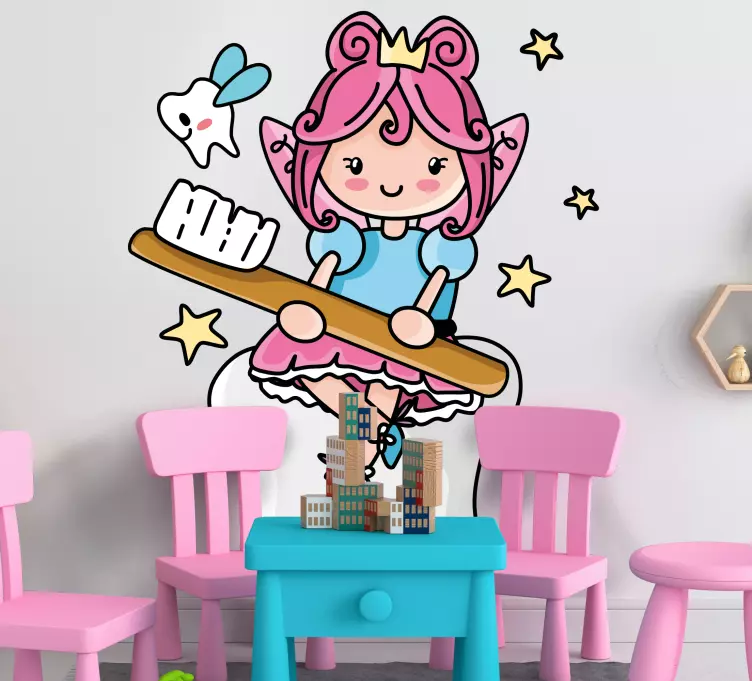 Scopri l'adorabile adesivo murale bambini fata dei denti, un elemento decorativo che trasformerà la camera dei tuoi piccoli in un luogo incantato! Il design presenta una fatina dei denti giocosa e sorridente, dotata di uno spazzolino in mano e circondata da un'atmosfera di fantasia. I colori rosa e stravaganti rendono questo adesivo carino e perfetto per stimolare l'immaginazione dei bambini!
