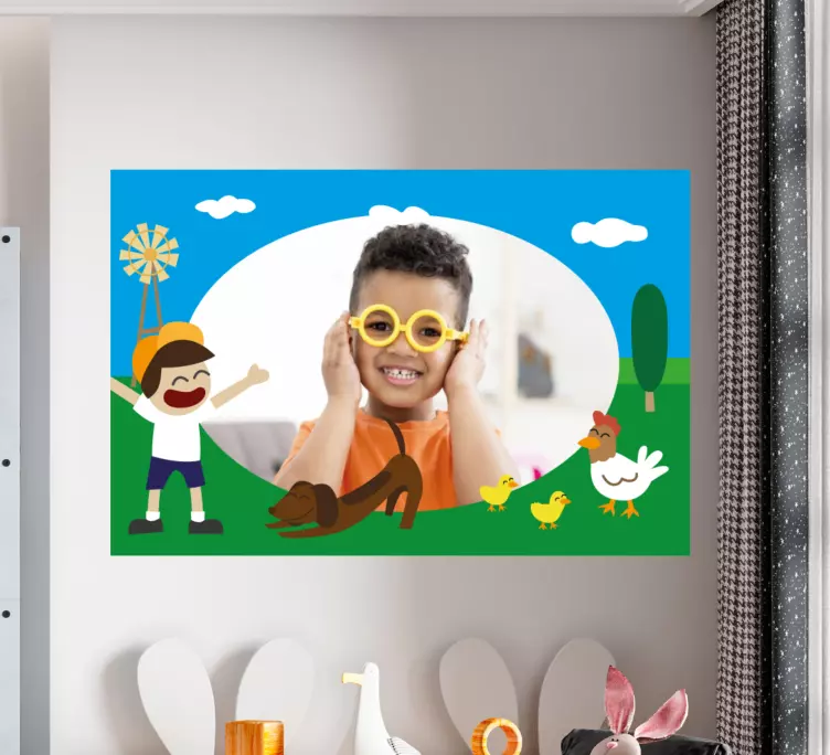 Scopri il nostro adesivo murale bambini scena di fattoria giocosa, un'allegria colorata che trasforma qualsiasi ambiente! Con un design vivace e cartoonesco, questo adesivo rappresenta un ragazzo in costume circondato da adorabili animali di fattoria. Perfetto per esporre le foto dei tuoi cari in un portafoto unico, questo prodotto è un modo stravagante e divertente per decorare la cameretta del tuo bambino.