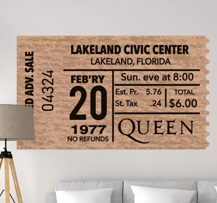 Il nostro adesivo murale biglietto centro civico lakeland cattura l'essenza di un evento musicale indimenticabile! Con un design che ricorda un biglietto per un concerto, il nostro adesivo presenta in modo creativo una data, un evento e un'atmosfera festosa, rendendo ogni spazio unico e ricco di energia.