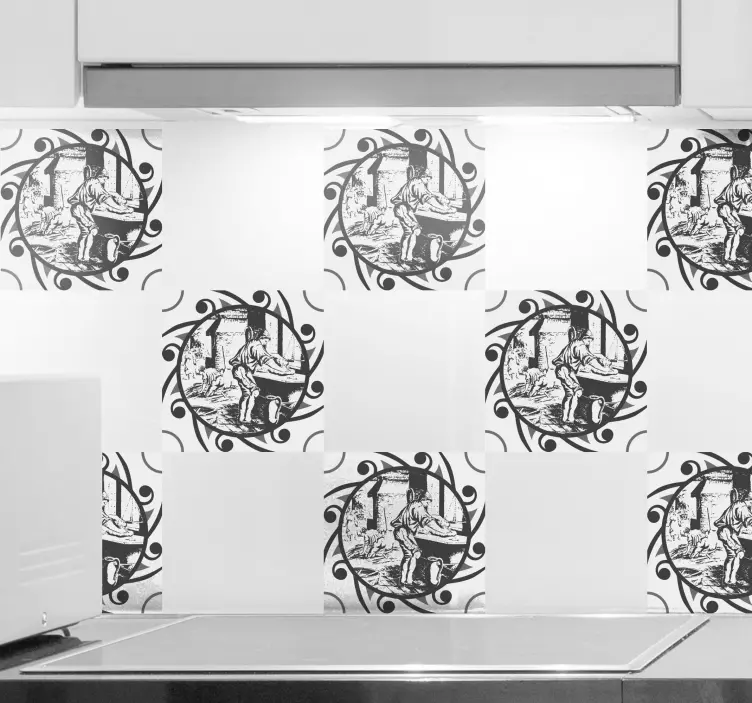 Riferimento: A52160Questo design presenta una scena artigianale vintage, che mostra un artigiano che lavora diligentemente a un tavolo, circondato da elementi decorativi che si avvolgono. I dettagli intricati catturano un senso di nostalgia e arte, rendendolo un'aggiunta accattivante a qualsiasi spazio.