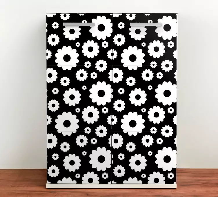 Scopri il nostro Adesivo per frigo copertura artistica botanica, un elemento di design che trasforma il tuo frigorifero in un'opera d'arte! Caratterizzato da un motivo floreale con margherite in un elegante contrasto bianco e nero, questo modello si inserisce perfettamente in uno stile moderno di arredamento e rappresenta una scelta ideale per la progettazione della casa.