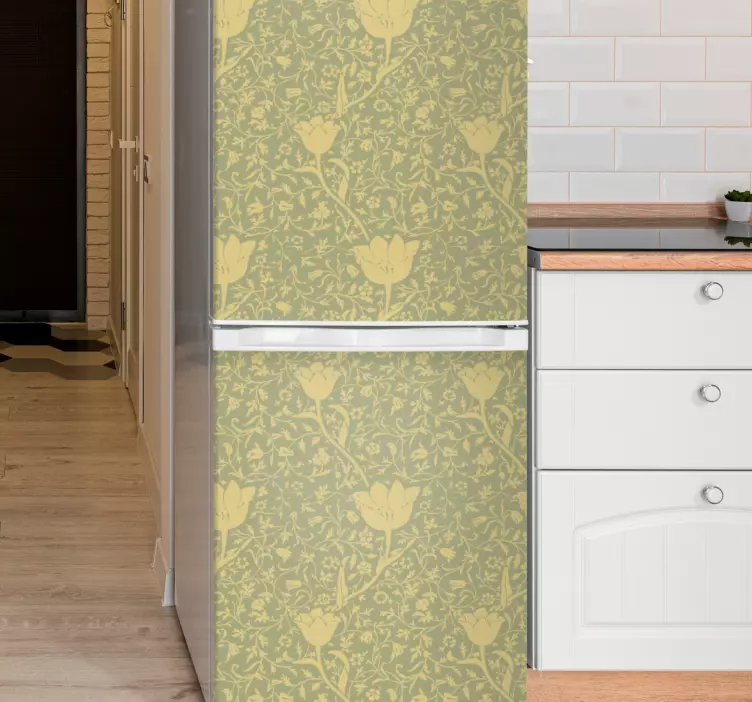 Scopri il nostro adesivo per frigo design a motivi floreali, un elemento di decorazione che trasforma il tuo frigorifero in un'opera d'arte! Questo design elegante presenta un delicato motivo floreale con fiori gialli e verdi che evocano la bellezza della natura, donando un tocco di freschezza alla tua cucina. Il suo stile raffinato e il color oro aggiungono un accento di lusso, rendendo ogni ambiente più accogliente e vivace!