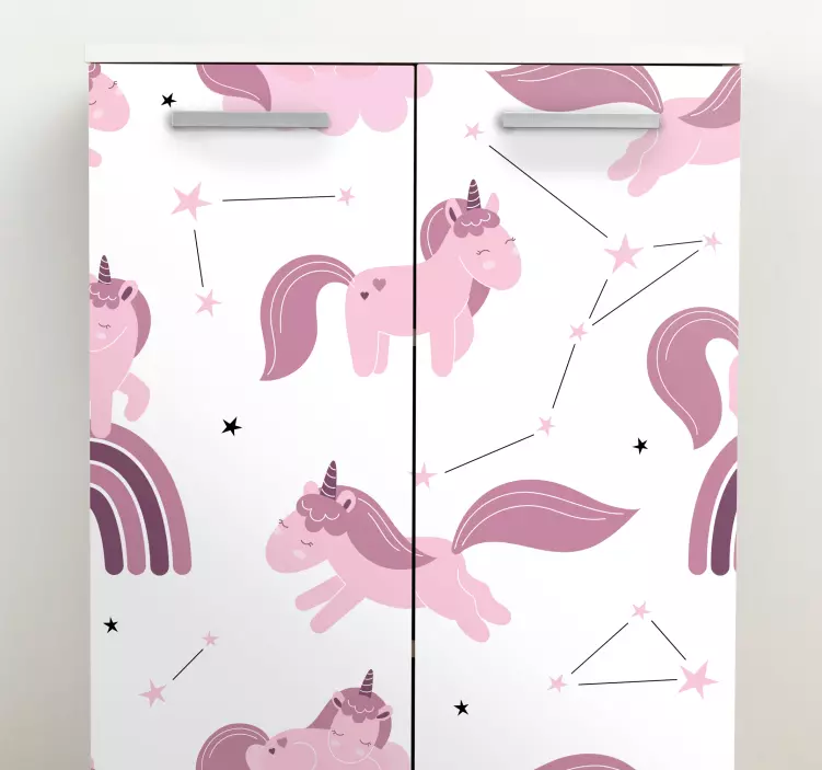 Scopri la nostra carta adesiva per mobili motivo unicorno rosa, un prodotto che trasforma ogni ambiente in un mondo magico! Con un design adorabile che presenta unicorni, costellazioni e arcobaleni su uno sfondo rosa, questo modello è perfetto per arredare armadi e stanze dei bambini. La fantasia carina di stelle e unicorni farà brillare gli occhi di chiunque la osservi!