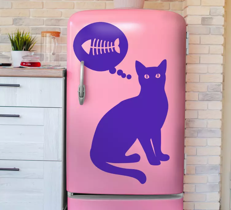 Scopri il nostro Adesivo per frigo silhouette di gatto pensieroso, un fantastico elemento decorativo che cattura l'attenzione con il suo design originale e divertente. Questa silhouette di un gatto pensieroso, accompagnata da una nuvoletta di pensiero e una lisca di pesce, è perfetta per gli amanti degli animali domestici. Con dettagli che richiamano a gatti, gattini e pesciolini, questo adesivo porterà un tocco di allegria nella tua cucina!