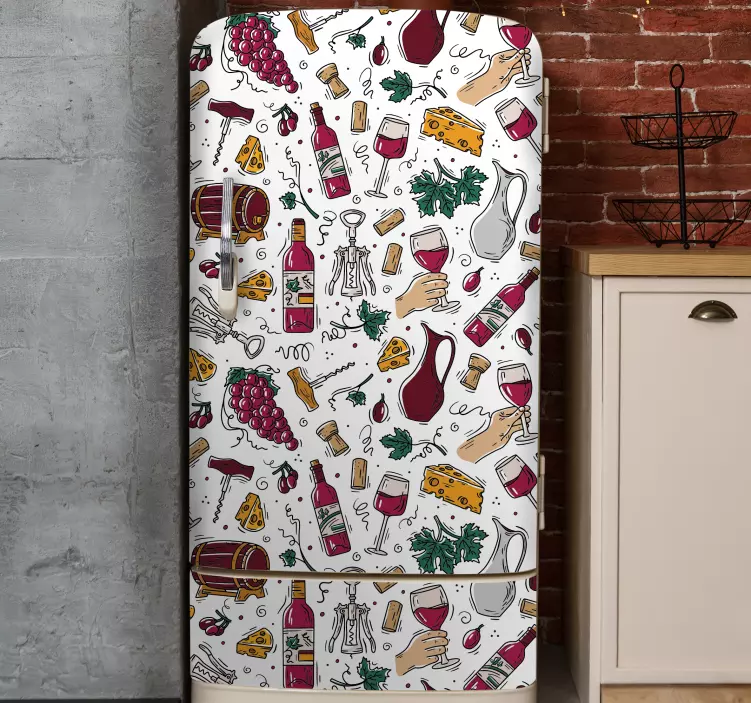 Scoprite il nostro adesivo per frigo tema cibo e vino, un design esclusivo e accattivante che trasforma il vostro frigorifero in un'opera d'arte culinaria! Ispirato ai piaceri del palato, questo adesivo presenta un frigo decorato con bottiglie di vino, un bicchiere di vino, uva, e formaggio, tutto disegnato a mano per esaltare il vostro amore per la cucina e per i buongustai!