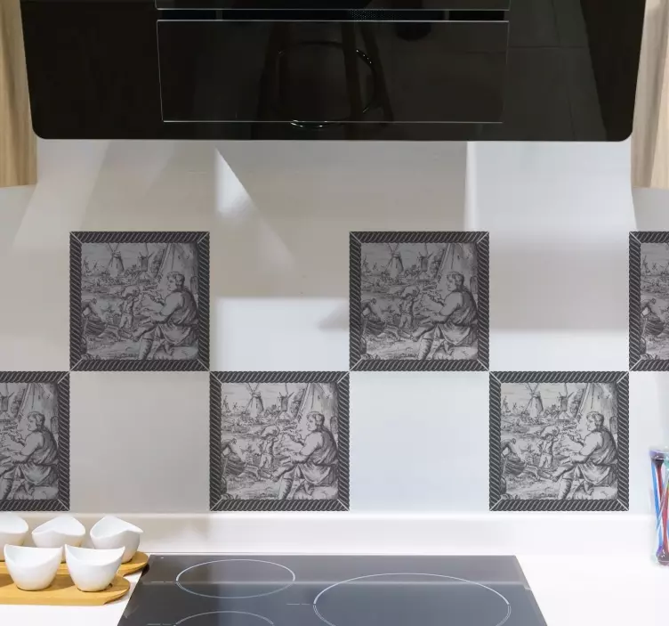 Scopri il nostro adesivo per piastrelle scene storiche, un'opera d'arte che trasforma ogni parete in un capolavoro. Con un design che ritrae uomini al lavoro, mulini e suggestivi paesaggi in un elegante bianco e nero, questo adesivo per piastrelle unisce l'artigianato a un tocco artistico e culturale, rendendo ogni spazio unico e affascinante.