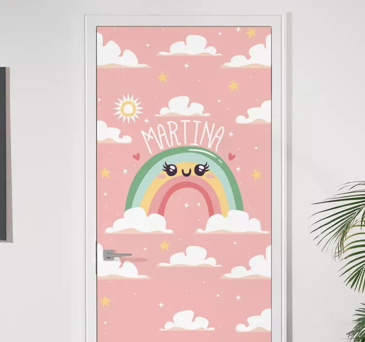 Scopri il nostro adesivo per porta design arcobaleno personalizzato, un fantastico elemento decorativo che trasforma ogni porta in un'opera d'arte! Il design grafico include una porta incantevole circondata da nuvole e un arcobaleno vibrante, perfetto per portare un tocco di divertimento e carineria nella tua casa. Personalizzabile con il tuo nome, questo adesivo è ideale per chi ama esprimere la propria creatività in modo originale e unico!