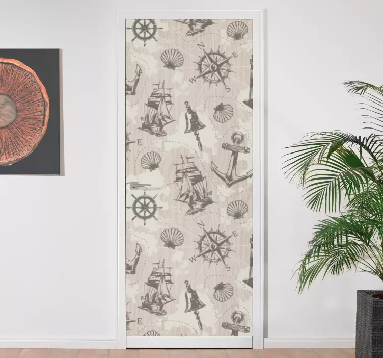 Scopri il nostro adesivo per porta tema avventura nautica, un design grafico che trasforma la tua porta in un'affascinante illustrazione nautica! Caratterizzato da dettagli come ancore, tavole di legno e fari, questo adesivo evoca l'emozione di andare in barca lungo la riva e sulla sabbia del litorale. Con un tocco di magia marina, ogni elemento, dalle conchiglie alle navi, si unisce per creare un'atmosfera che porta il mare a casa tua!