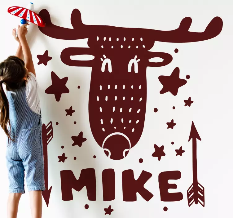 Scopri il nostro adesivo personalizzabile faccia di cervo fantasiosa, un'opera d'arte grafica che unisce elementi nordici e giocosi, con una dolce renna circondata da stelle e frecce, perfetto per esprimere la personalità dei tuoi bambini. Personalizza il tuo adesivo con il nome che desideri e porta un tocco di magia nella stanza dei più piccoli!