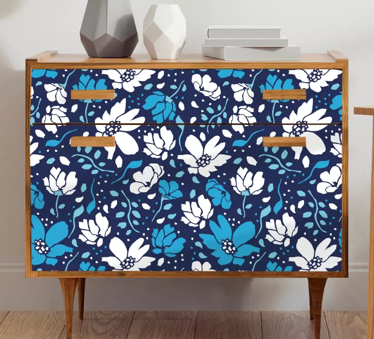 Scopri la nostra carta adesiva per mobili cassetti a motivi floreali, un prodotto che trasforma i tuoi spazi con il suo splendido design. Caratterizzata da vivaci margherite, fiori, un elegante modello floreale in tonalità di blu e bianco, arricchita da foglie che evocano la natura, questa carta adesiva è perfetta per chi desidera un arredamento fresco e originale!