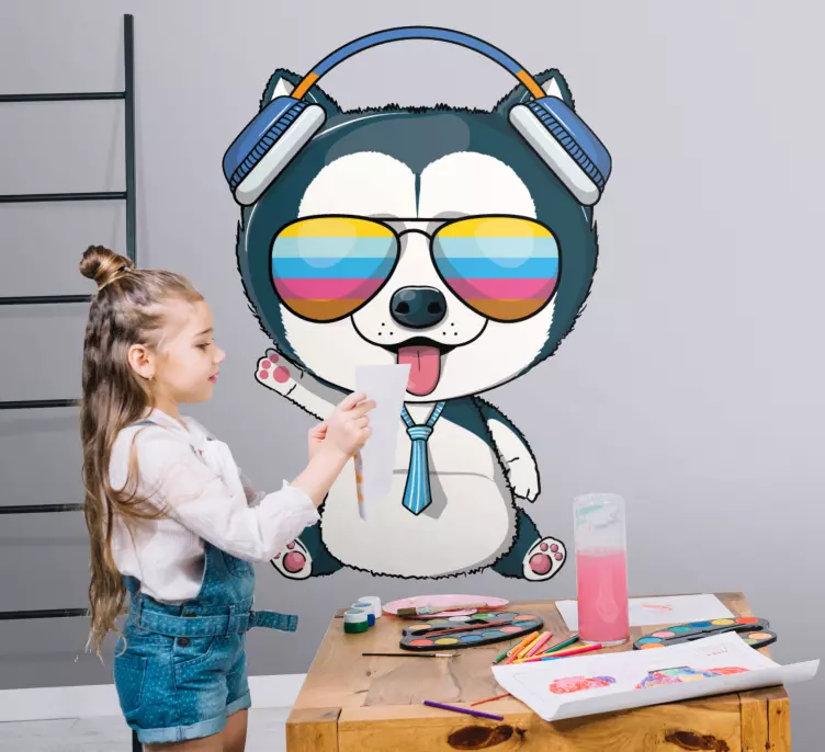 Porta un tocco di divertimento e originalità nella tua vita con il nostro Sticker animale domestico personaggio animale cool! Questo design unico presenta un cane cucciolo con occhiali da sole e cuffia, perfettamente realizzato in stile cartone animato. Carino e colorato, è un adesivo che sprigiona musicalità e giocosità, rendendo ogni spazio più vivace e accogliente.