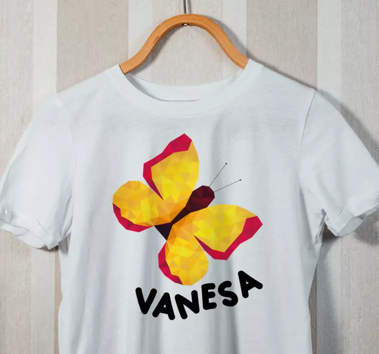 Riferimento: T4993Questo affascinante design presenta una vivace farfalla con una brillante combinazione di tonalità gialle e rosse. Le forme geometriche aggiungono un tocco moderno, mentre la scrittura in grassetto del nome ne esalta l'appeal personale. Perfetto per mostrare un'atmosfera allegra e giocosa.