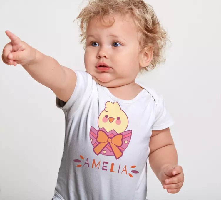 Scopri la nostra maglietta bebè pulcina carina con fiocco, un design adorabile che presenta un pollo giocoso con un nastro colorato e un uccellino felice che emerge da un uovo. Questo capo è perfetto per i più piccoli, con dettagli che includono il nome personalizzabile e un pulcino adorabile che cattura immediatamente l'attenzione! Il suo stile è pensato per rendere ogni bambino ancora più carino e unico!