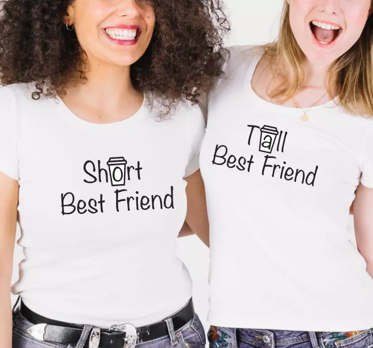 Riferimento: T4553Questa immagine mostra due amici che indossano magliette abbinate che etichettano umoristicamente le loro altezze. Una maglietta dice 'Short Best Friend' mentre l'altra recita 'Tall Best Friend'. Il testo giocoso sottolinea la loro amicizia e connessione.