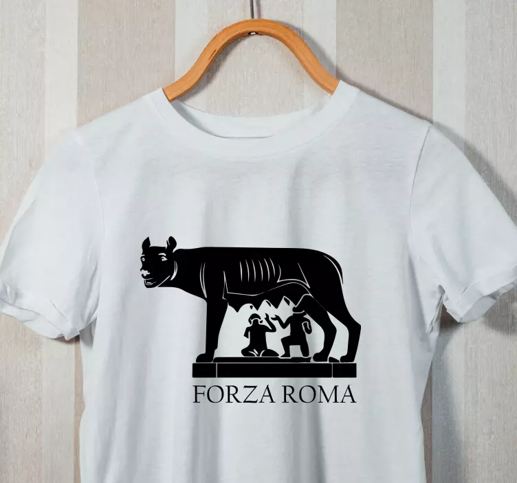 Meravigliosa t shirt bianca con un design in colore nero di un lupo e di due uomini: Romolo e Remo. La creatività dello storico e mitologico. Il design ha uno scritto anche che dice: "Forza Roma", ideale per sostenere tutti gli sport vincolati con la città eterna: Roma. Questa maglietta per uomo e molto creativa e ti fa pensare alla storia dell'Impero Romano, e anche perché Roma è una città fantastica e magica. È una t shirt uomo bellissima, fatta con vinile, molto leggera e fresca. E se vuoi fare qualche cambiamenti, soltanto devi scriverci al nostro email e il nostro team di servizio clienti ti aiuterà.