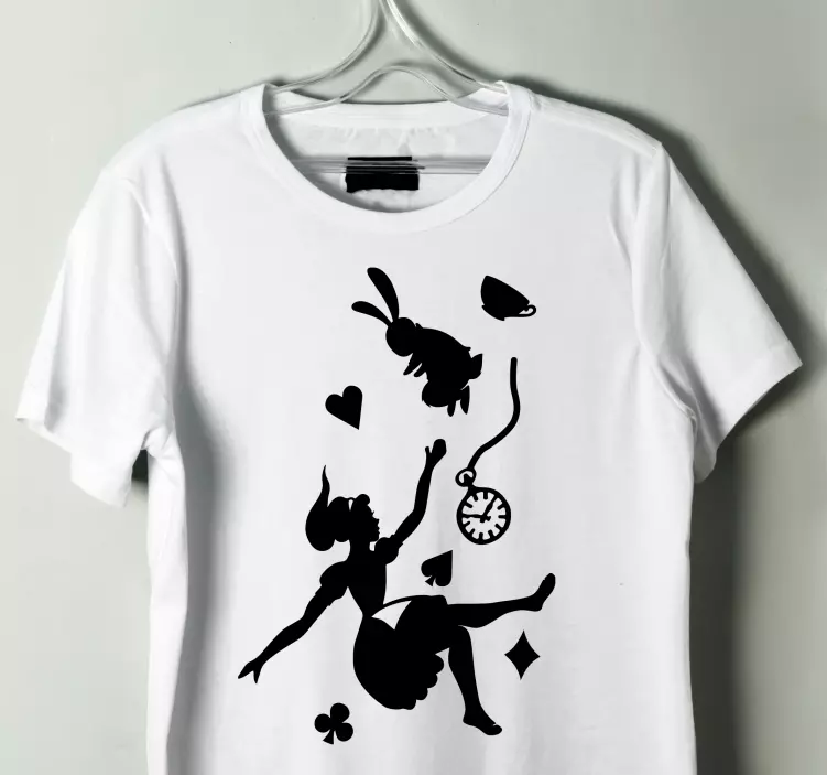 Scopri la nostra Maglietta infantile divertente festa del tè, un capo d'abbigliamento che cattura l'immaginazione con un design stravagante: un coniglio cadente, Alice nel paese delle meraviglie, un orologio da tasca e cuori che danzano insieme a sagome incantevoli! Questo è il regalo perfetto per i piccoli sognatori!