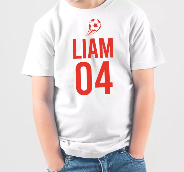 Riferimento: T4113Questo design presenta un vivace tema calcistico, con il nome 'Liam' affiancato dal numero '04'. I colori sono accattivanti, con audaci tonalità di rosso che si contrastano con uno sfondo bianco, perfetto per i giovani appassionati di calcio.