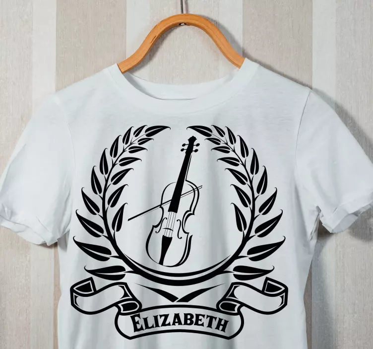 Riferimento: T4492Questo design unico presenta un violino al centro, circondato da una corona di alloro. Il nome 'Elizabeth' è elegantemente presentato su un nastro sotto l'emblema, a significare un tocco personale. La palette di colori monocromatica enfatizza la natura classica e raffinata del tema.
