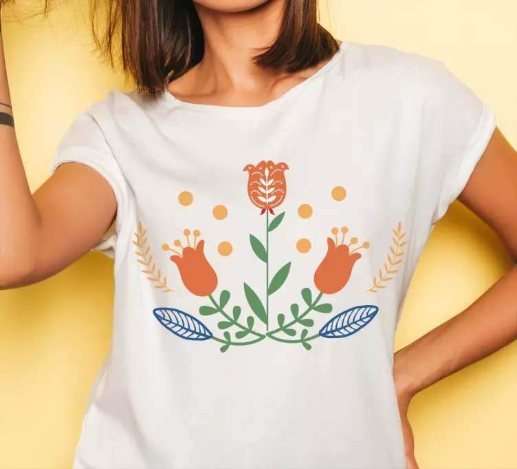Riferimento: T4357Questo design vivace mostra fiori e foglie disposti con cura, evocando una sensazione di primavera. I colori caldi e i punti giocosi accentuano la sensazione organica, rendendolo perfetto per l'abbigliamento casual. Ideale per chi apprezza temi ispirati alla natura e il comfort elegante.