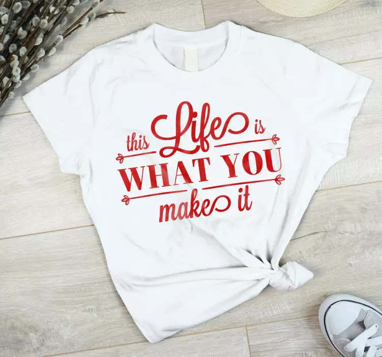Riferimento: T4937Questo design presenta una forte citazione motivazionale che sottolinea il tema che la vita è ciò che ne fai. I caratteri in grassetto e i colori vivaci catturano l'attenzione, rendendolo un'ottima scelta per un abbigliamento casual che ispira positività.