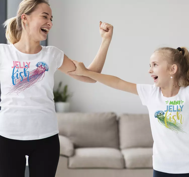 Riferimento: T5235Questa vivace immagine mostra una madre e una figlia che condividono momenti gioiosi, entrambe vestite con top coordinati che presentano vivaci immagini di meduse. Il design giocoso mette in risalto il loro legame e crea un'atmosfera divertente e colorata, perfetta per esprimere amore e unità.