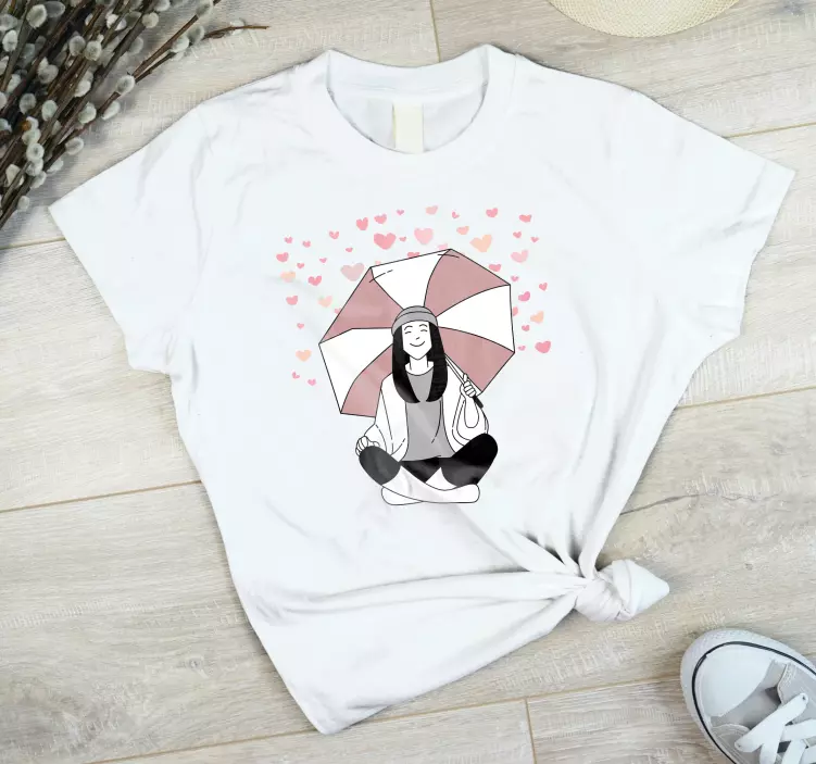 Scopri la nostra maglietta motivo cuore incantevole, un capo d'abbigliamento che unisce stile e comfort! Il design grafico rappresenta una ragazza in stile cartone animato con un ombrello colorato circondata da cuori, simbolo di amore e spensieratezza, perfetta per chi ama esprimere la propria personalità con un outfit carino e sorridente. Questa maglietta è ideale per chi cerca un look casuale e comodo, perfetto per ogni occasione!
