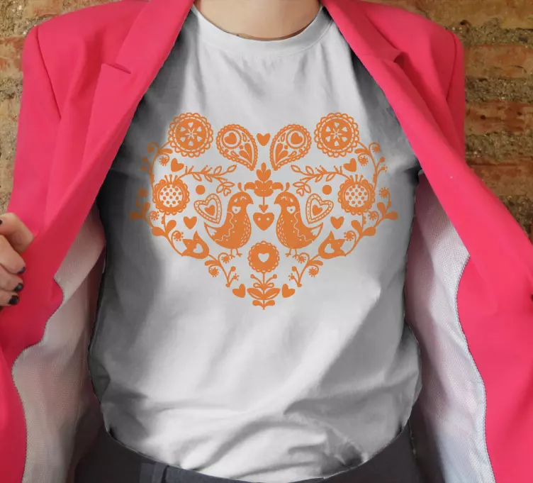 Scopri la nostra maglietta uccelli con motivo cuore, un vero capolavoro di design che combina il folclore polacco con elementi tradizionali e ornati. Questo design unico presenta uccelli e fiori in un mix di bianco e nero che esprime l'amore attraverso la sua bellezza floreale. Indossare questa maglietta è come portare con sé un pezzo di arte popolare che celebra la vita!