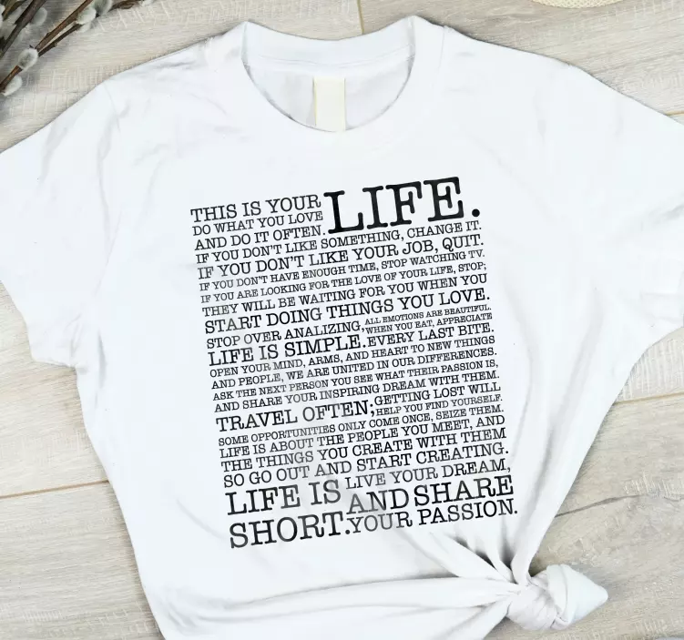 Riferimento: T4871Questo design presenta un messaggio ispiratore che incoraggia le persone a vivere la propria passione e ad abbracciare le opportunità della vita. Il testo in grassetto amplifica il tema motivazionale, attirando l'attenzione e promuovendo una mentalità positiva. Perfetto per chi cerca incoraggiamento attraverso l'espressione indossabile.