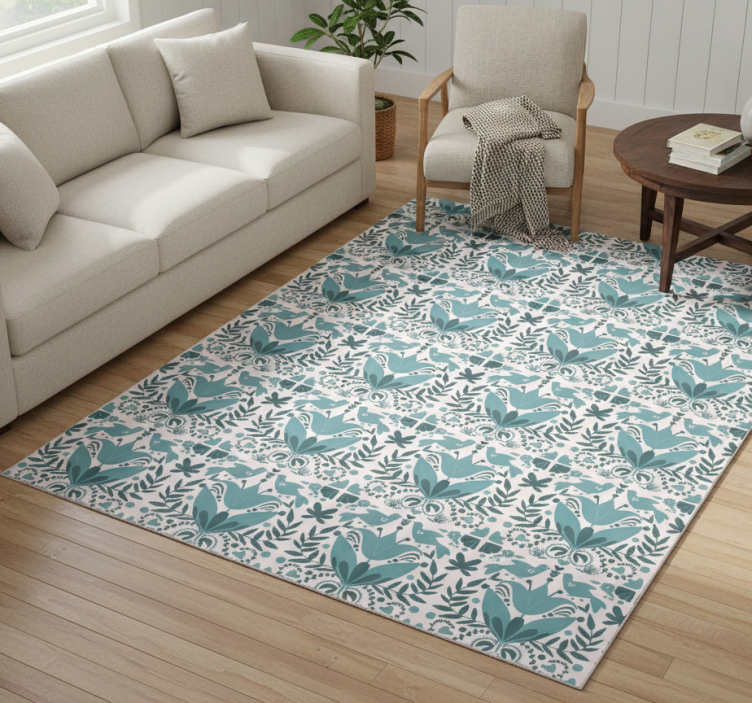 Tappeto vinile fiori motivo folk blu con uccelli
