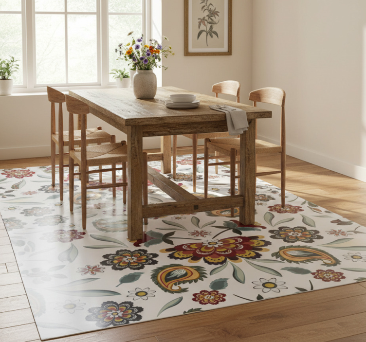 Riferimento: R20911Il tappeto vinile fiori stile floreale etnico è un'opera d'arte per il tuo spazio, caratterizzato da un design vivace e colorato con fiori etnici stilizzati, forme geometriche che si intrecciano in un'armonia di colori caldi e freschi, rendendo ogni ambiente unico e accogliente!