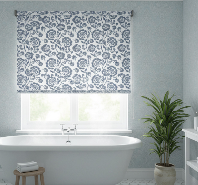 Tenda a rullo bagno fiori blu su sfondo bianco