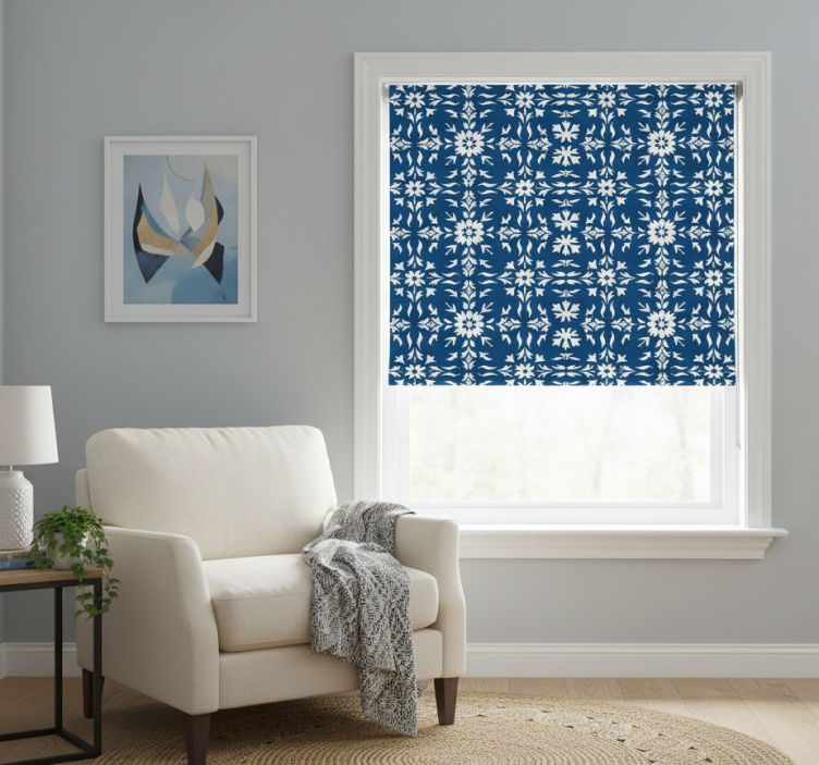 Tenda a rullo blu con motivo a piastrelle bianche