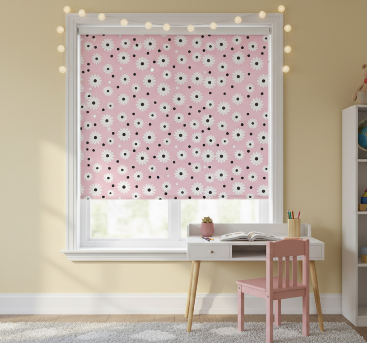 Tenda a rullo cameretta motivo fiori a pois neri e rosa