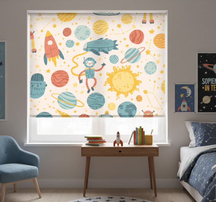 Riferimento: E7171La tenda a rullo cameretta scena avventura spaziale è un elemento di design unico che trasforma qualsiasi ambiente in un vero e proprio viaggio tra le stelle! Con colori vivaci, illustrazioni di astronavi e pianeti, e un'atmosfera che stimola la fantasia, questa tenda è perfetta per rendere la cameretta un luogo magico per i bambini. È facile da montare in 2 clic e da pulire, permettendo di mantenere sempre un ambiente fresco e accogliente.