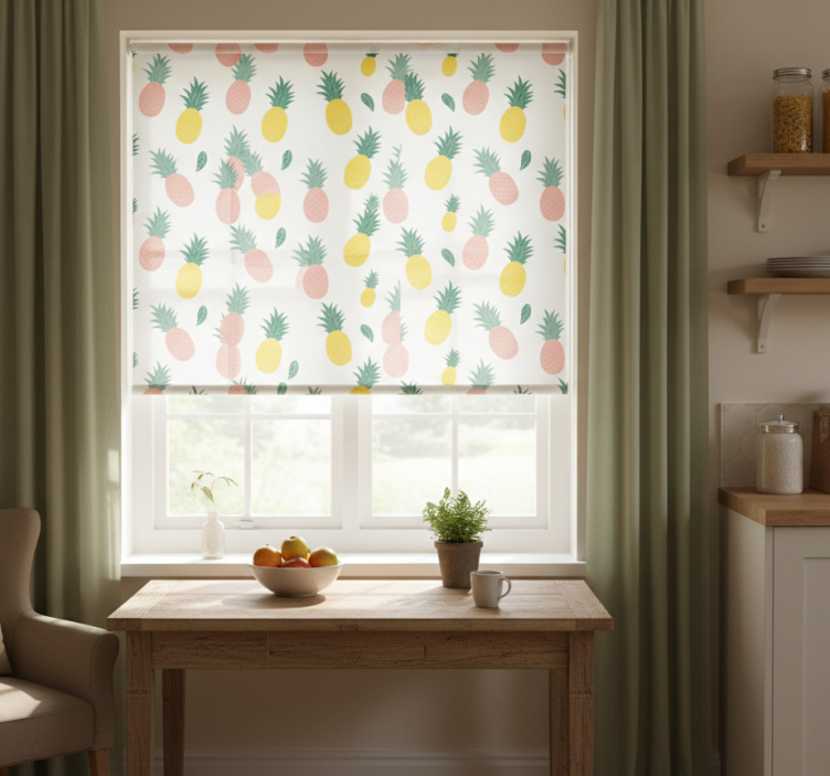Riferimento: E6372La tenda a rullo cucina design frutta ananas è un complemento d'arredo che porta un tocco di freschezza e vivacità nella tua cucina! Con un design colorato e allegro che rappresenta succosi ananas, questa tenda è realizzata in tessuto di alta qualità, facile da pulire, con un montaggio e smontaggio rapido in soli 2 clic, e offre una protezione efficace dalla luce solare diretta. La sua capacità di regolare la temperatura ambientale e di garantire privacy rende questo prodotto un must-have per ogni casa.