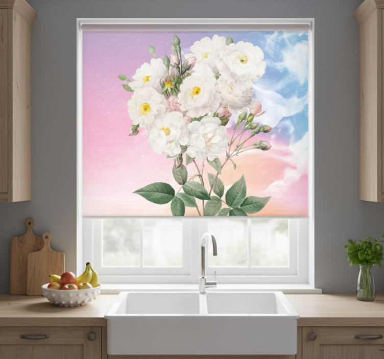 Tenda a rullo cucina fiori bianchi su sfondo blu arancio