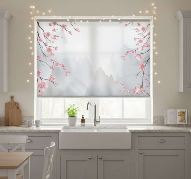 Tenda a rullo cucina fiori di ciliegio e montagne