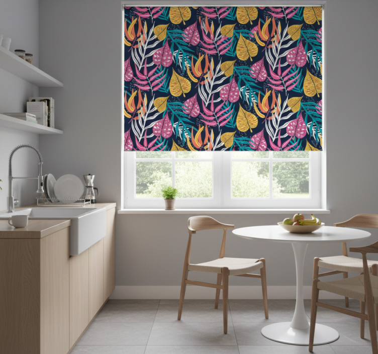 Tenda a rullo cucina foglie multicolori su sfondo blu