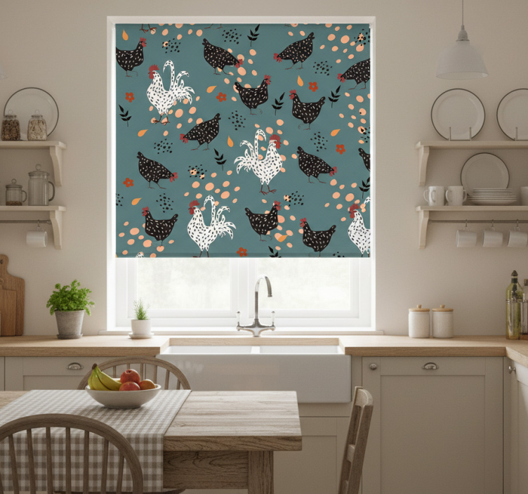 Riferimento: E6526La tenda a rullo cucina galline bianche e nere con fiori è un perfetto mix di eleganza e freschezza, caratterizzata da un design vivace e accattivante. Le galline bianche e nere danzano tra fiori colorati, portando un tocco di allegria e stile nella tua cucina e trasformando ogni pasto in un momento speciale!