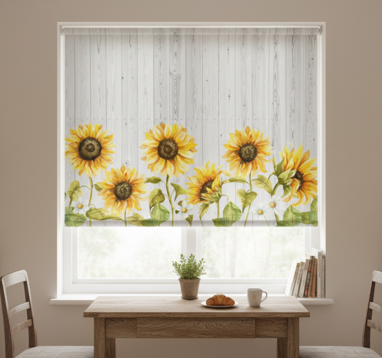 Tenda a rullo cucina girasoli su tavole grigie
