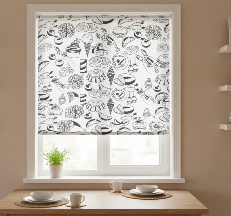 Riferimento: E6291La tenda a rullo cucina motivo cibo bianco e nero è un perfetto equilibrio tra stile e funzionalità! Con il suo design accattivante caratterizzato da motivi gastronomici in bianco e nero, questa tenda non solo abbellisce la tua cucina, ma porta anche un tocco di creatività e vivacità nell'arredamento. Facile da montare e da pulire, offre una soluzione pratica e decorativa per ogni spazio!
